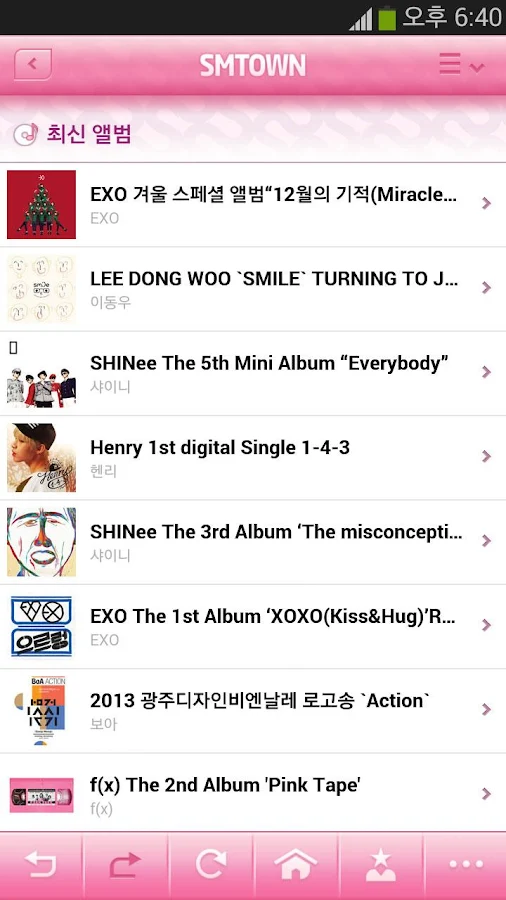 Esta aplicación nos muestra notícias, discos, vídeos, imágenes, etc... de artistas como Kang Ta, Boa, TVXQ, Super Junior, SNSD, SHINee, f(x) y EXO.